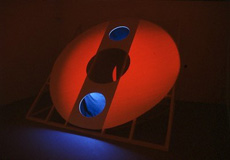 The Big 'O'1991 Site specific installation for Riverside Studios, London more information Wood, mirrors, fabric, projection, ultraviolet light.The shadow of the pillar in the space is used as an integral part of the installation.